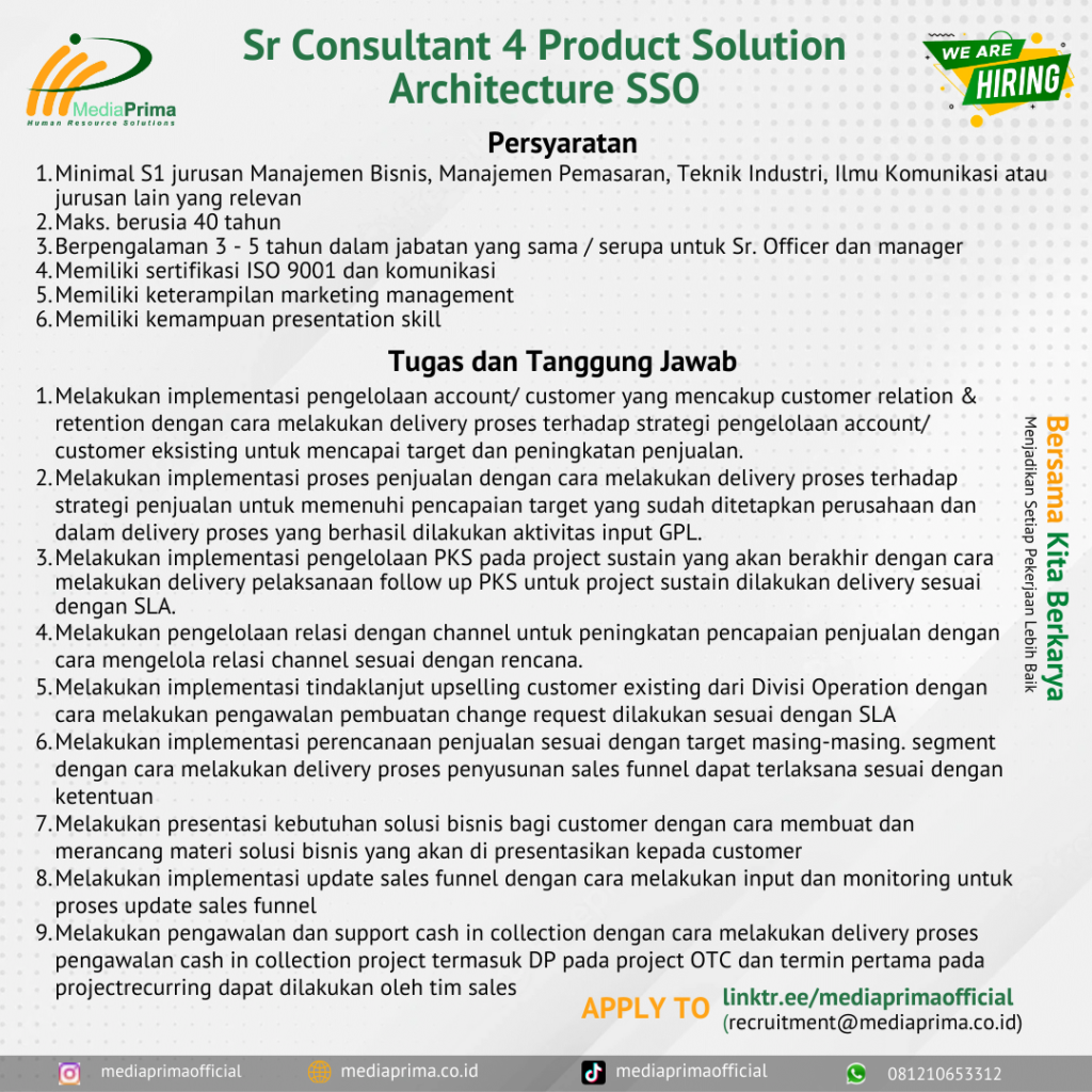 Lowongan Sr Consultant 4 Product Solution Architecture SSOMedia Prima07/06/2023Lowongan Kerja Lamar disini